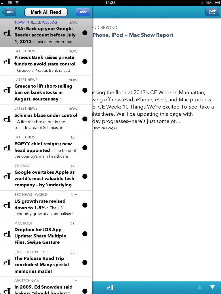 Up to now I have been obsessing about finding an aggregator that would sync with Reeder. I use Reeder apps on Mac and both my iOS devices. They have an excellent interface and an impressive list of features. As a result, in common with most users, I never accessed GR direct and relied entirely on supplementary reader apps for browsing articles and sending read-later stuff to Instapaper