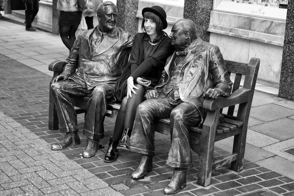 “I say, Roosers old chap, bit of an improvement on that old bugger with the moustache”. Photo by Mike Evans taken with Leica M and 35mm Summicron, monochrome conversion in Silver Efex Pro. The statue of the WWII duo, with seating area for you, is in Bond Street London and was the work of Lawrence Holofcener. Called “Allies”, it was dedicated by Princess Margaret in 1995.