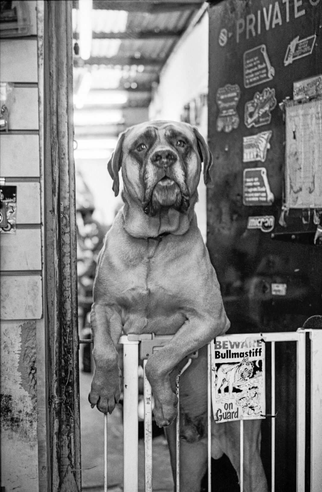 When I took my first ‘Town Dogs’ pictures in 2005, I wasn’t thinking of a project – I’d gone out to buy spark plugs. So finding Bruno minding the shop at Etty & Tyler’s, the motorcycle dealers in Forest Gate, was a bonus. A gentle giant of a dog, he welcomed any visitor who took him sliced ham or digestive biscuits. And he loved posing for the camera.