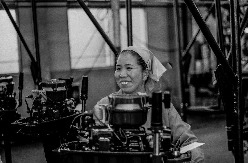 I took photographs in the Kawasaki small motor and motorcycle factories and Tohatsu outboard motor factory I visited. As the light was very poor I used a very fast film — Ilford HPS — which was harsh and grainy and which I developed at home. The photographs were all taken on the run as I was on business factory visits rather than sightseeing. Focusing was very difficult in the low light and even with the fast film the shutter speeds were slow. Camera shake ruined quite a few of the shots.