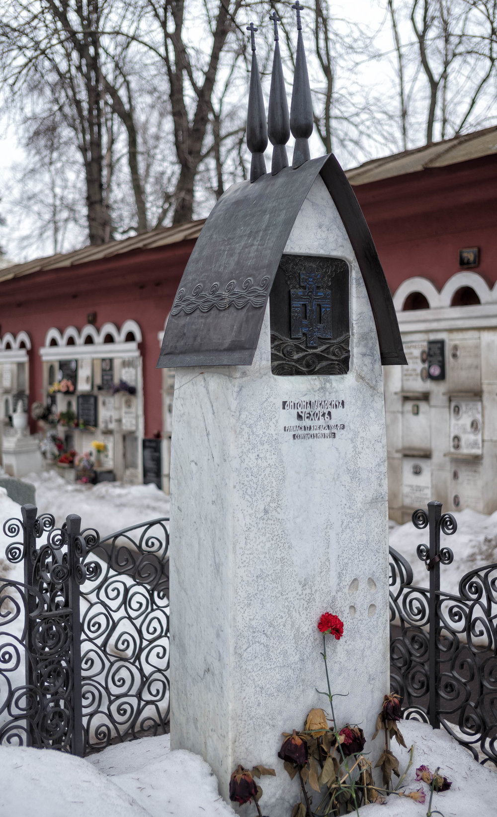 As well as politicians and soldiers, the graveyard also features artists (writers, poets, painters, sculptors and composers), aircraft designers and entertainers. Below from left to right are the graves of playwright Anton Chekhov, aircraft designer Tupolev (Ilyushin and Mikoyan were also there) and an actor whose name I cannot remember, but I thought that the flower in his hand was very nice as well as his โBuster Keatonโ hat.