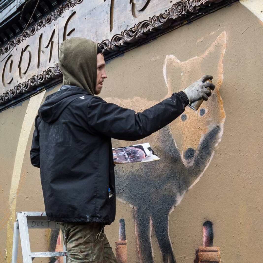 As the signature on the wall shows, this was painted by BKFOXX — initials BK; FOXX as in the animal apparently — from Long Island, New York, in September 2018. The gates to the yard and café were being closed and I noticed the white door in the wall being opened by the man locking up the site which provided an interesting effect. I asked around, found him working in the shop on the corner and asked him for a favour: happily he obliged.