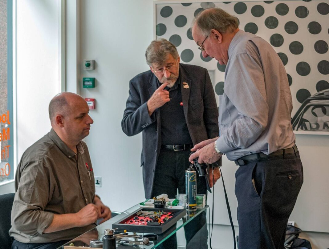 If you own a Leica compact or a Q/2 you’re in luck. Leica is still handling repairs in London. In this picture, Leica’s technician David Slater, left, demonstrate how to strip down a Q for the benefit of Leica Society members, including Nobby Clarke (centra) and Peter Anderson (right)
