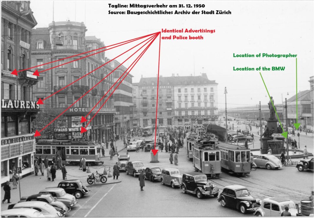 This trip did not take place in 1945-46. There are features in the first photo from Bahnhofplatz in Zurich which were not there before 1950. I have already dealt with the issue of the sunglasses. Europeans then and now could wear American sunglasses if they wanted to. They were also not obsessed with having ‘ this year’s model’ and wore whatever they liked.