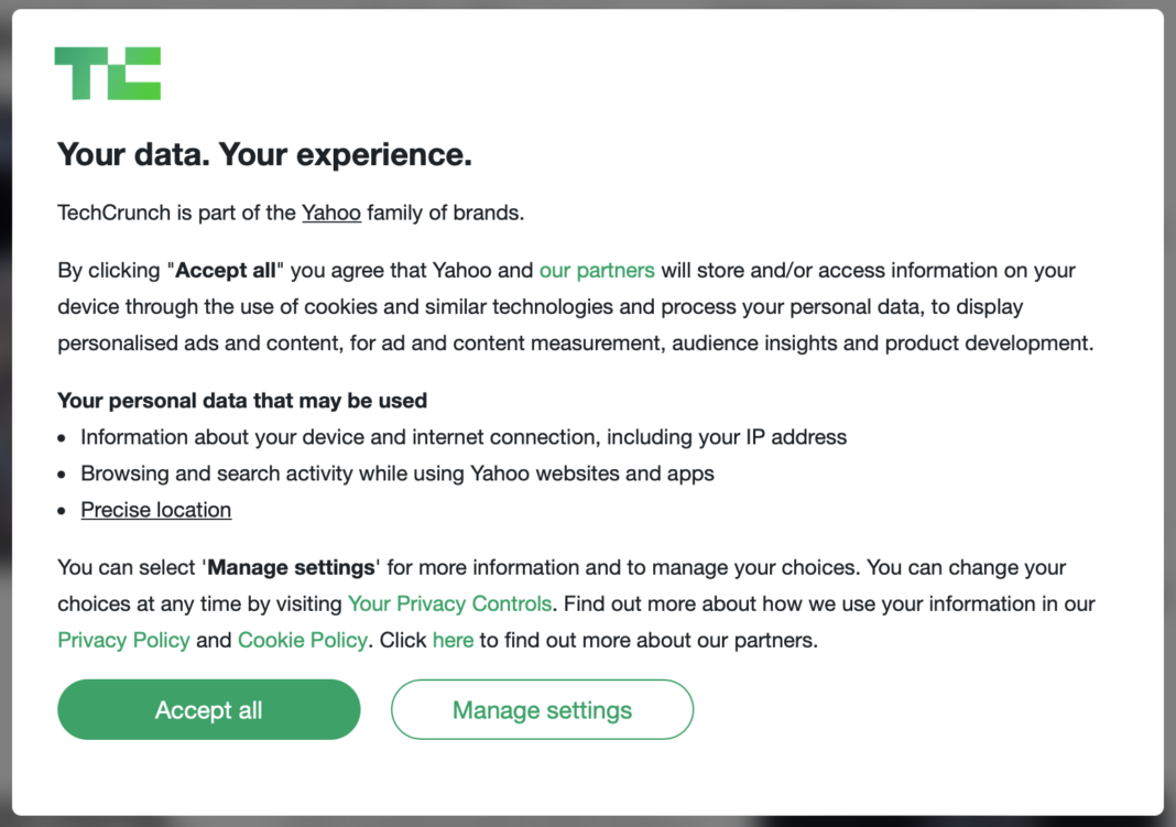 Who is going to read all this, let alone selectively consider every option? The marketing managers just hope you’ll be overwhelmed and “accept all”. Increasingly, however, the main options are presented as “off” as in the above example from TechCrunch. But delve a little deeper and you’ll find that other intrusive options relating to data gathering and advertising are “on” by default. It’s necessary to click the REJECT ALL button to be safe, before clicking on Save and Continue. What’s worse, you have to go through all this rigmarole every time you access a site.