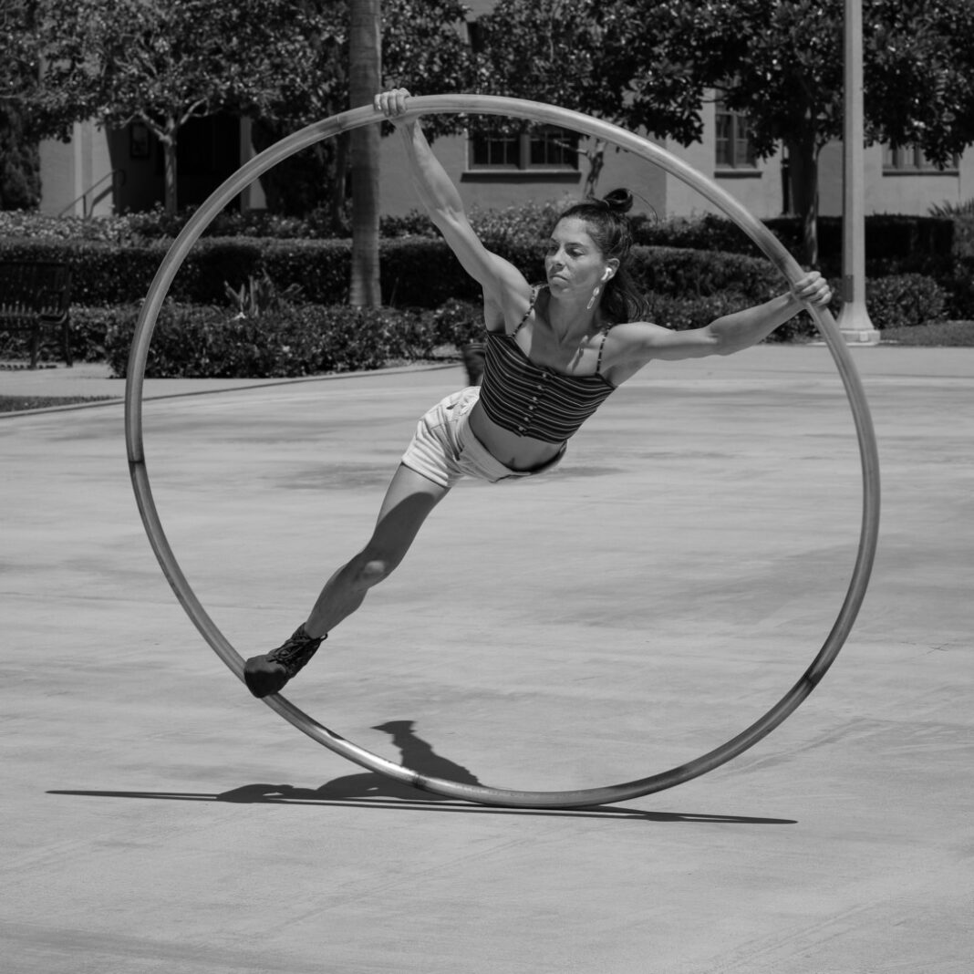 The next photograph shows another acrobat named Liz practising her skills with an apparatus called a Cyr wheel. The device, a large steel or aluminium ring slightly taller than the performer, is named after Daniel Cyr, a circus performer who brought it to prominence at the end of the last century.