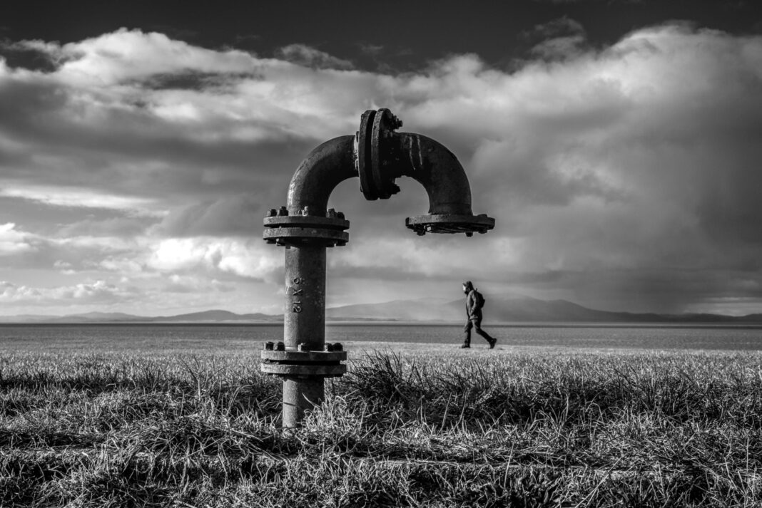 Photo 1: Lonely, deserted vista, rusty old pipe (..looks like an air vent from a deserted subterranean cold war ‘Regional Seat of Government’), one lonely passer-by, glowering heavy sky (red filter?), looks to me like desolation.
