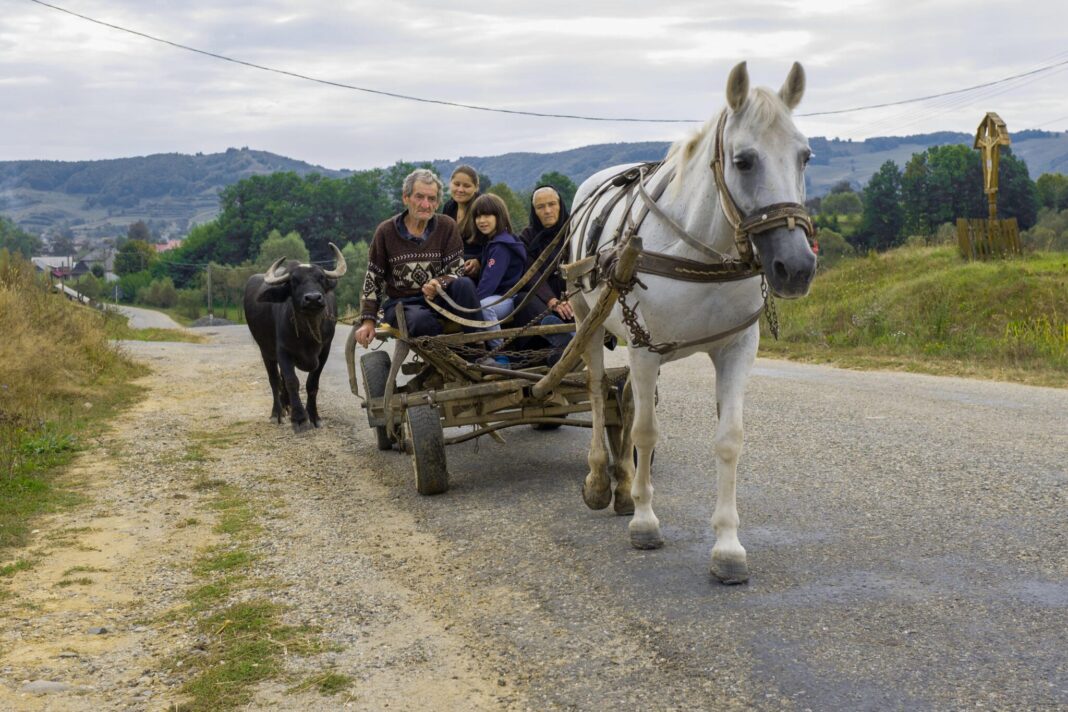 This particular horse and wagon certainly ticked all the boxes. A dilapidated wagon, a noble white horse, an ox at the rear and, of course, the passengers. The sad and worn grandmother, grandfather, and two apparently happy grandchildren loomed in front of the wonderful rural location with the cross beside the field. I hypothesise they were coming home after a hard day’s work harvesting hay. The children were either staying with their grandparents for the summer holidays or, more possibly, living with their grandparents whilst their parents were working in Bucharest or another city.
