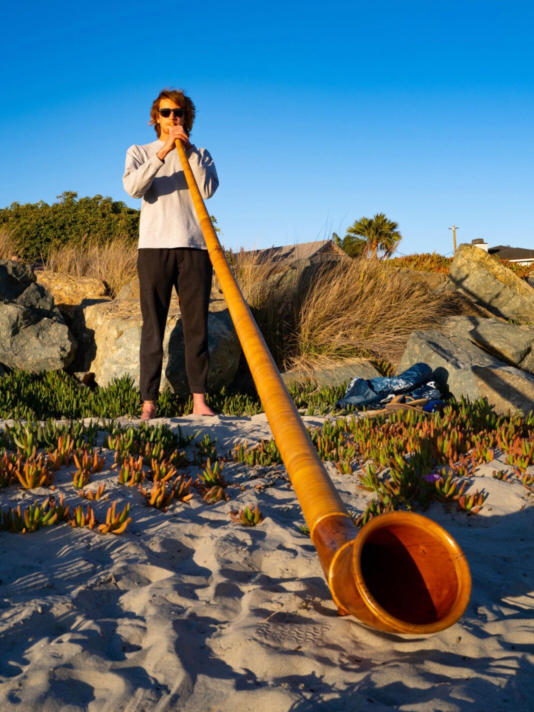 The most extreme depth of field challenge I have encountered was in photographing an alphorn player at the beach. Why there was an alphorn player on the beach in Southern California is another story, but he generously allowed me to photograph him from multiple vantage points while he practised. I took a pair of shots from a similar angle while prostrate in the sand. I shot the first closed down at f/11 (shown earlier) and the second wide open at f/1.7, focused on the mouth of the horn. Which do you prefer?