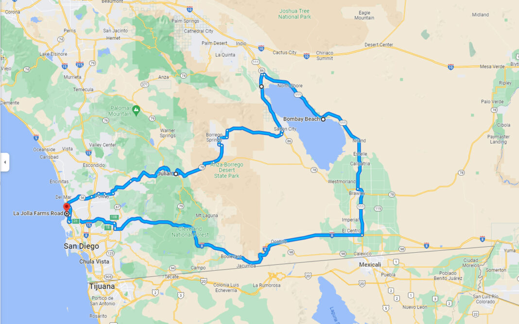 As you can see from the map, our counter-clockwise route took us over the mountains to the Imperial Valley. We began our journey in pouring rain, ran into snow at the summit and finally reached warm spring sunshine.
