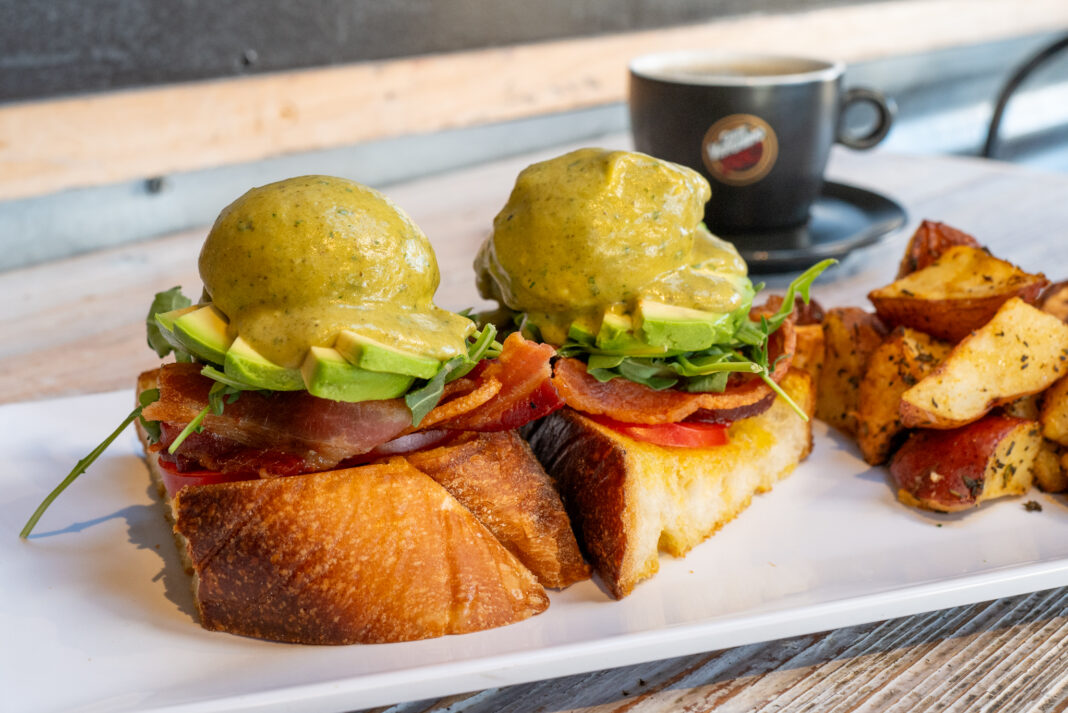 The image above is typical of the candid food photography Macfilos has published. It is a close-up of an Eggs Benedict variant inspired by a favourite American sandwich: the BLT. In fact, it’s an avocado BLT, featuring bacon, lettuce, tomato, and avocado on a slice of focaccia. In customary fashion, it is topped by a poached egg and Hollandaise sauce, in this case flavoured with cilantro.