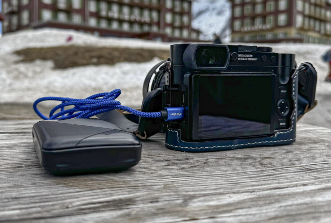 In theory, this means that the power bank will top up the Leica battery twice on a single charge, although regard it as good for one full charge. On the other hand, the tiny battery of my Ricoh GRIII (900 mAh and storage of 3.3 Wh of energy) can be charged several times during the day (and it needs it).