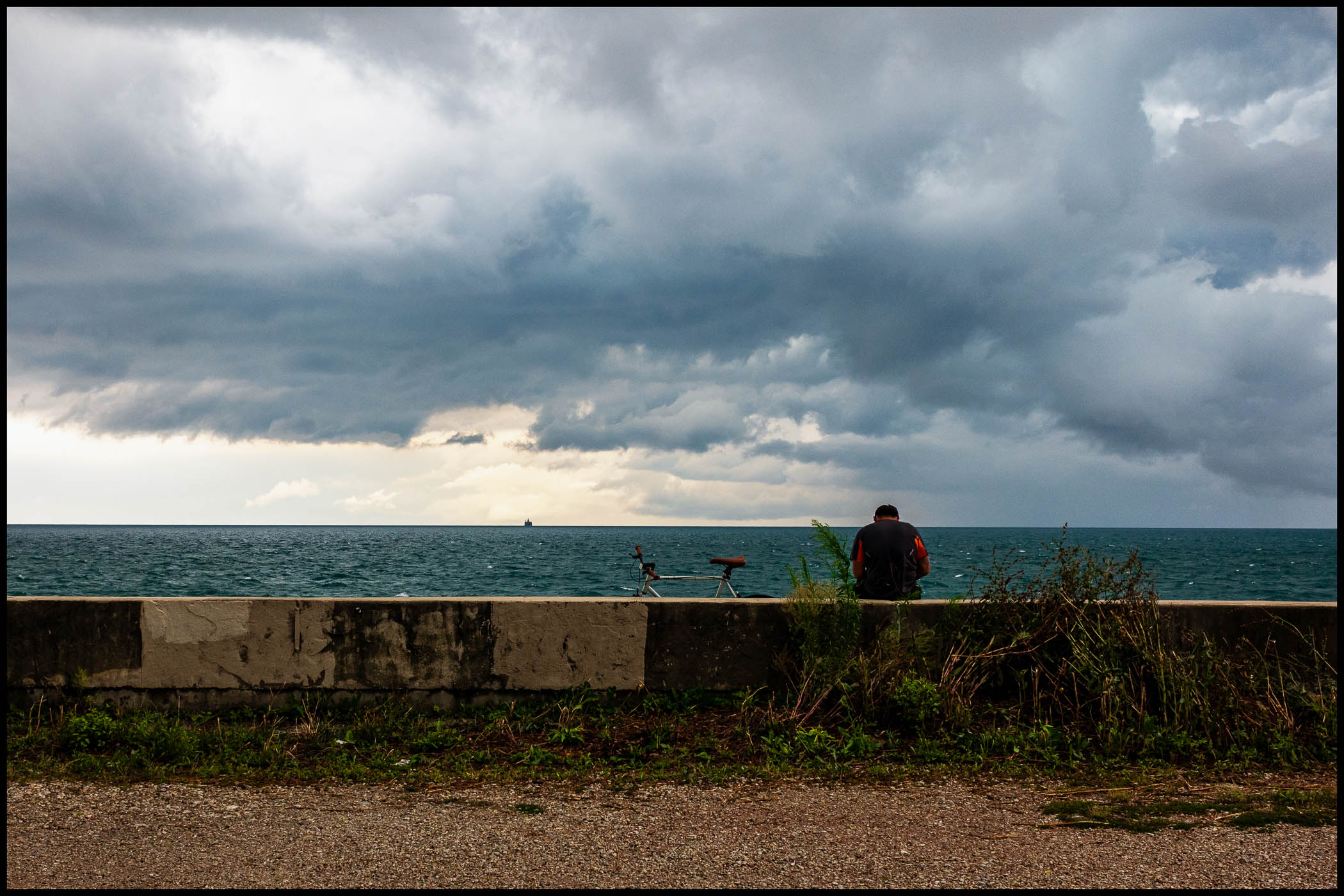 You can see the impending arrival of the thunderstorm. This is a spot on the lakefront where people often come to contemplate. This man was there for some time with his bike. He could obviously see and feel the storm coming, but did not move from his spot.