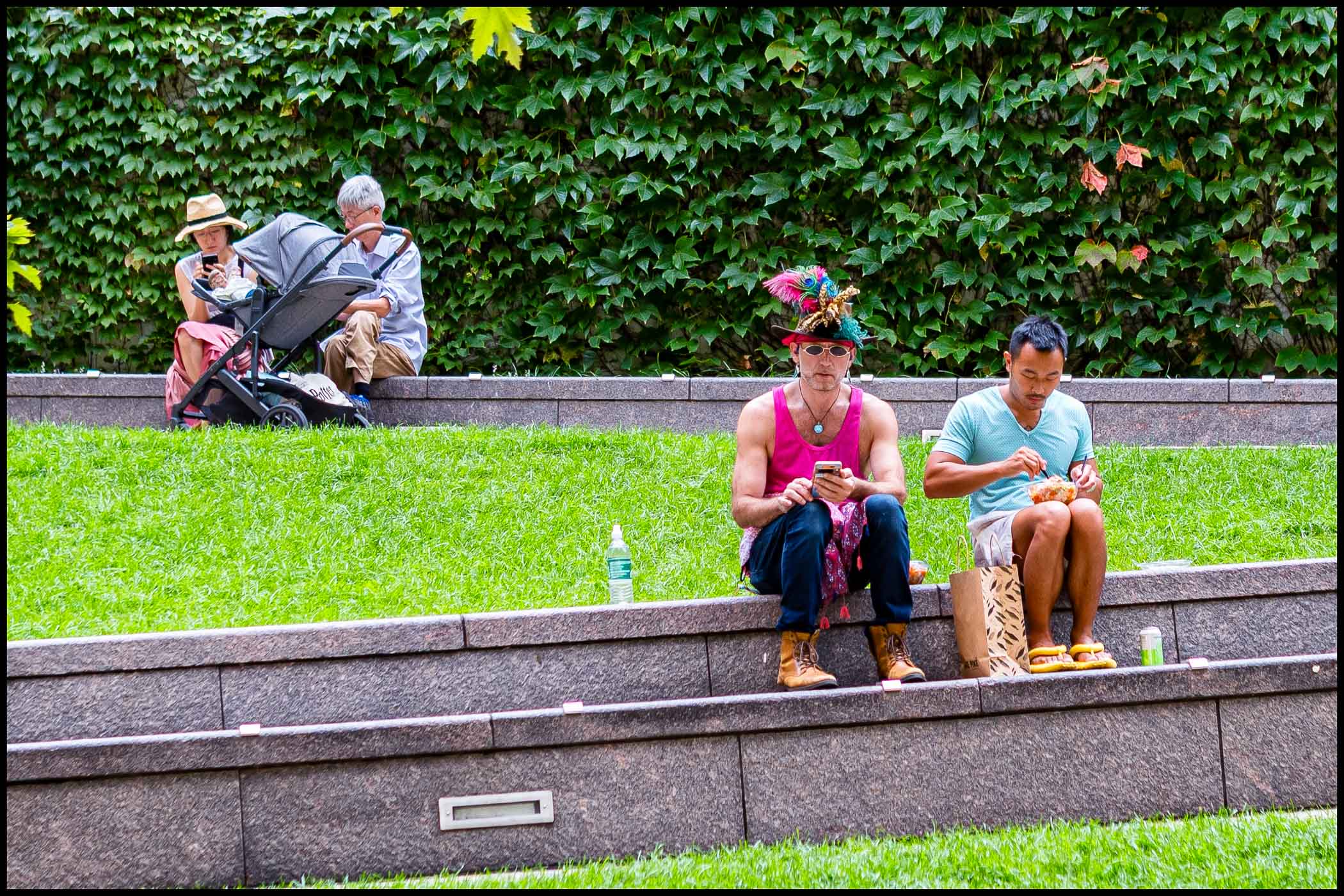 You get to encounter some fascinating people on downtown walkabouts in summer. โBirdmanโ and his mate were seemingly oblivious of the fact that he was a little out of the ordinary. No โbirds of a featherโ gathering here: more โMcCaw parrotโ on acid.