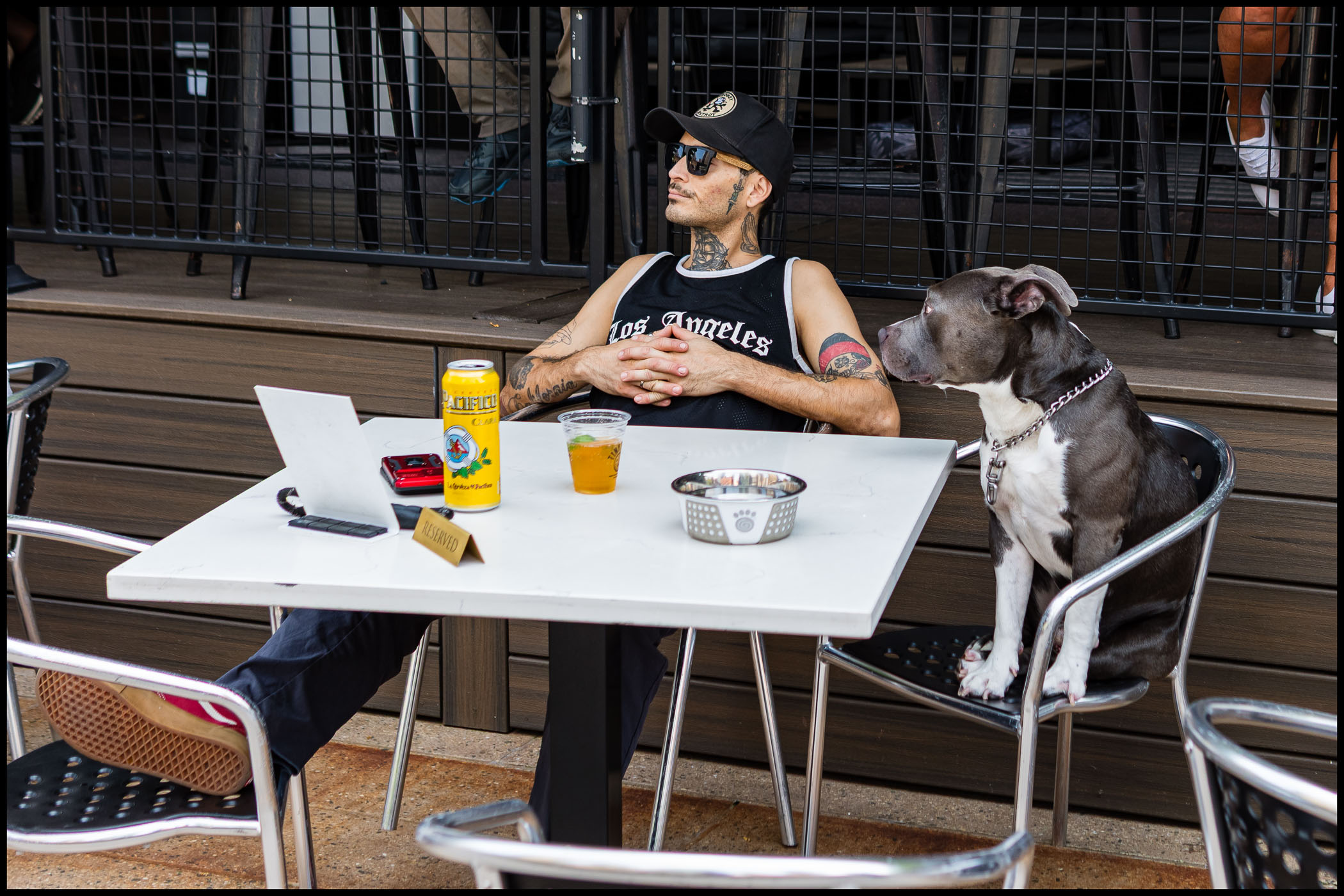 The second character I called โDonโt askโ and his dog. He wasnโt interested in engaging, nor was his dog. The table and three chairs were all his domain. But with an equivalent 45mm view, I could get close enough without being intrusive. Best to move on then! At that point, I felt a need for nine lives more than nine lenses.