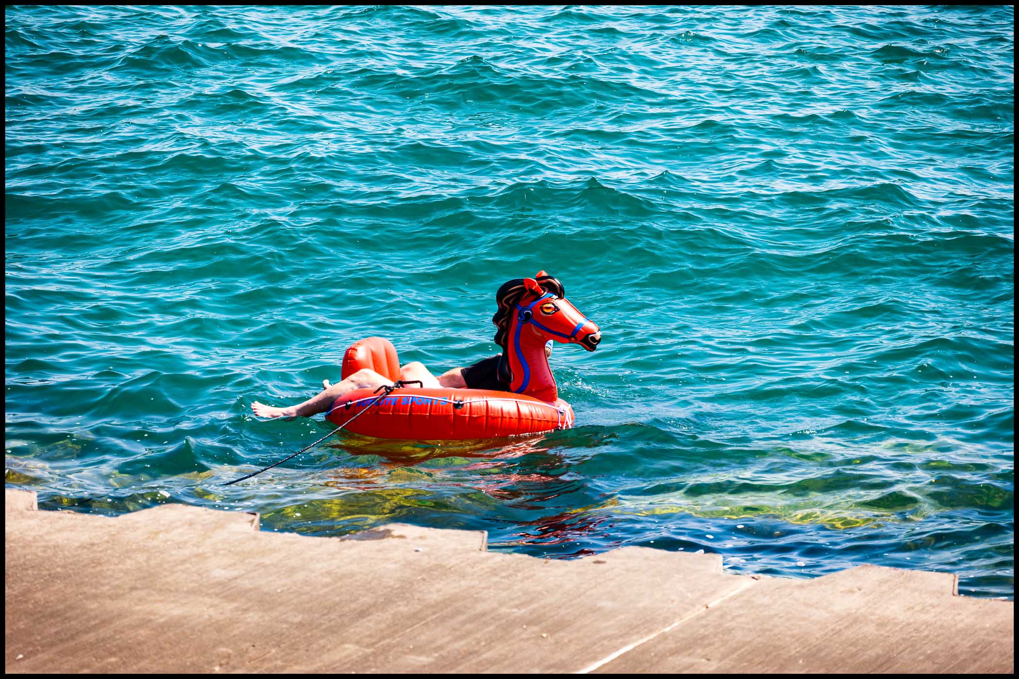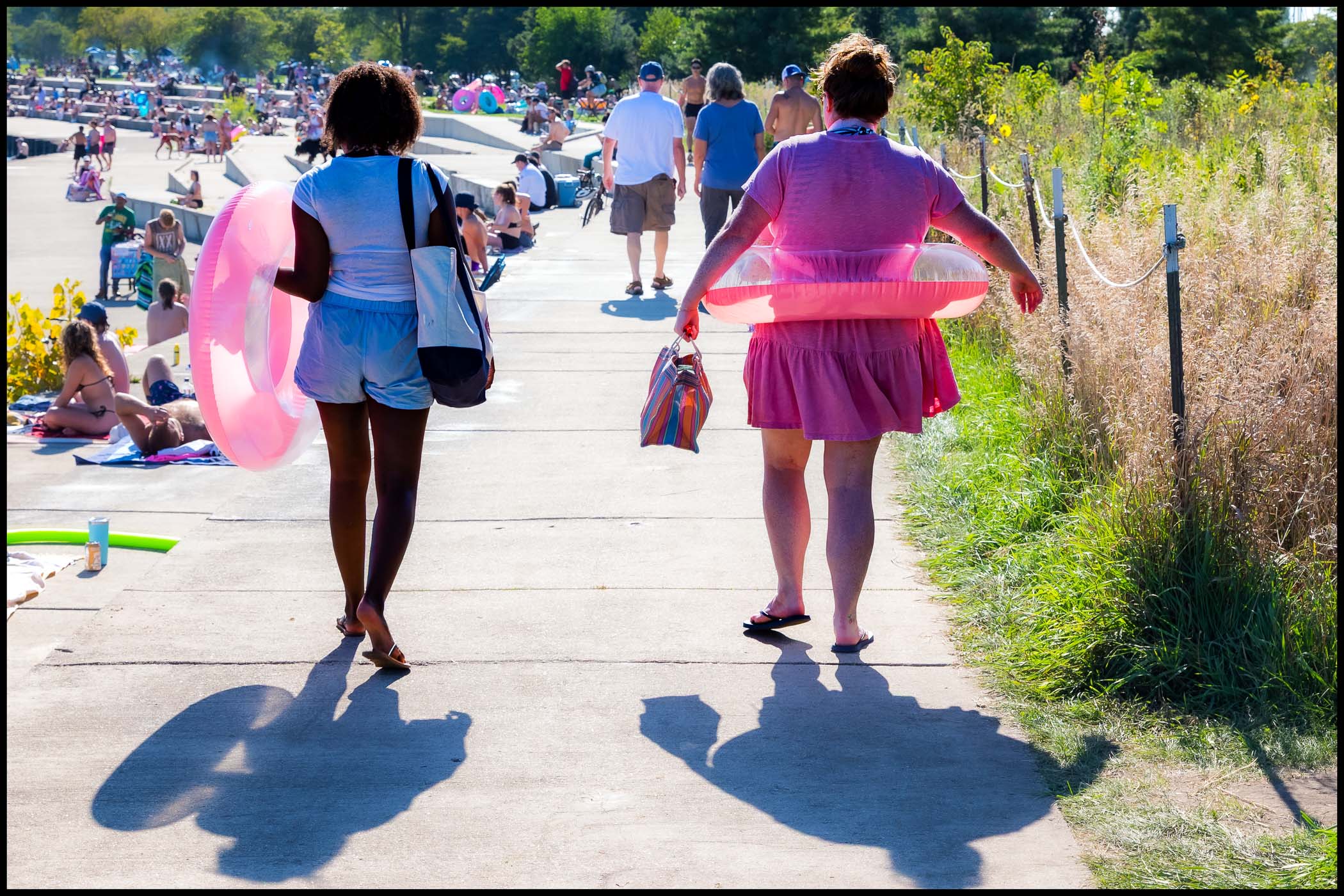 I was amused by this โcontre-jourโ shot of the two ladies with their inflatable pink rings. All thatโs missing is an ice cream cone for each of them. Itโs quite hard for the CL to handle even this dynamic range, with the highlights right on the edge of being blown out. Aperture was f/5.6 to try to get some separation, but I couldnโt go any further without blowing out the main characters. Did someone say ND filters?
