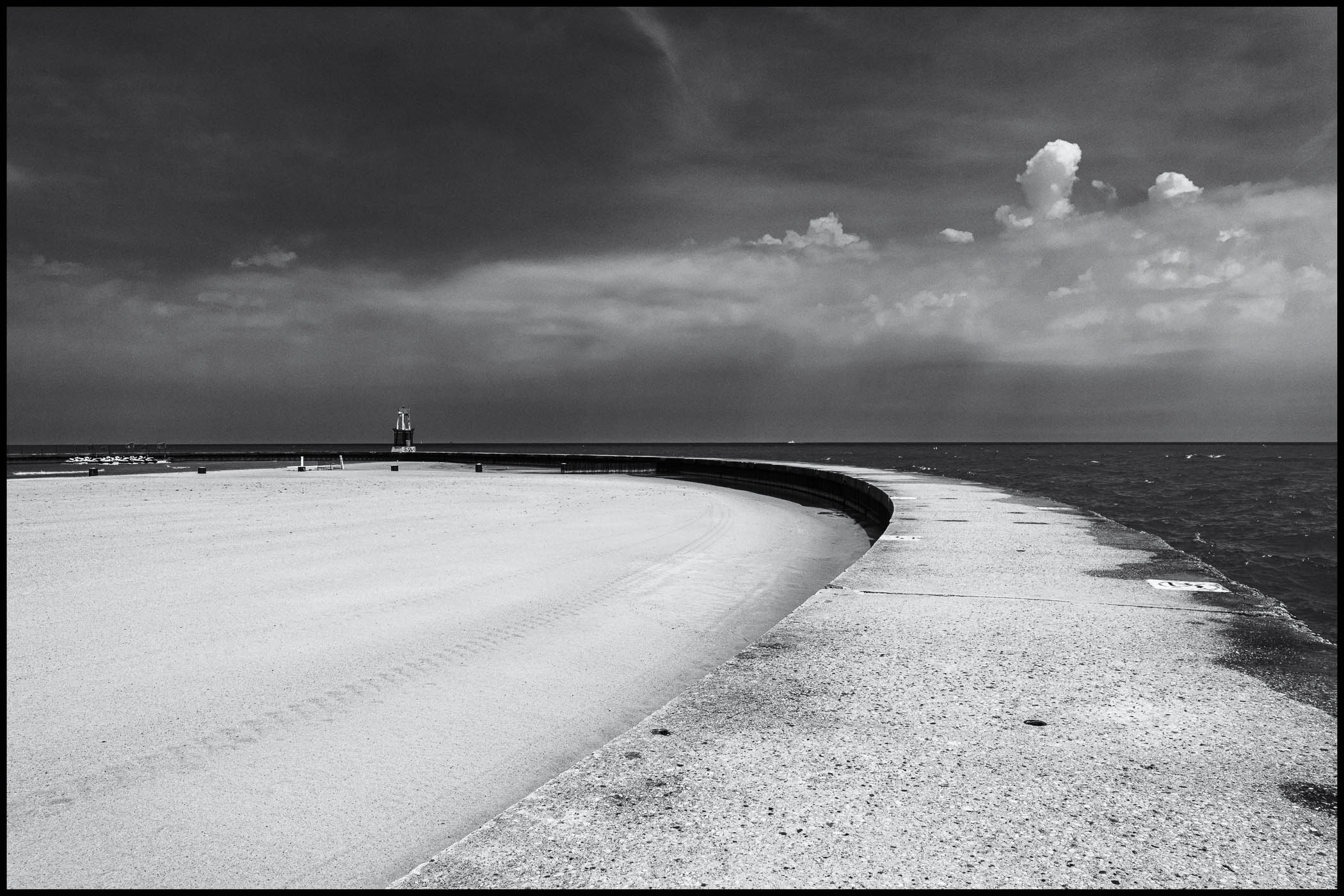 The second shot, taken close by, highlights the curve of the protective wall leading to a navigation light. And yes, that Churchillian summer storm was approaching! I use Silver Efex Pro for B&W, and here it almost feels like an infrared shot. Look at this on a full screen โ all 27 inches of it โ and pixel-peep. I never normally do this but with the TL 11-23mm it’s a joy to behold.