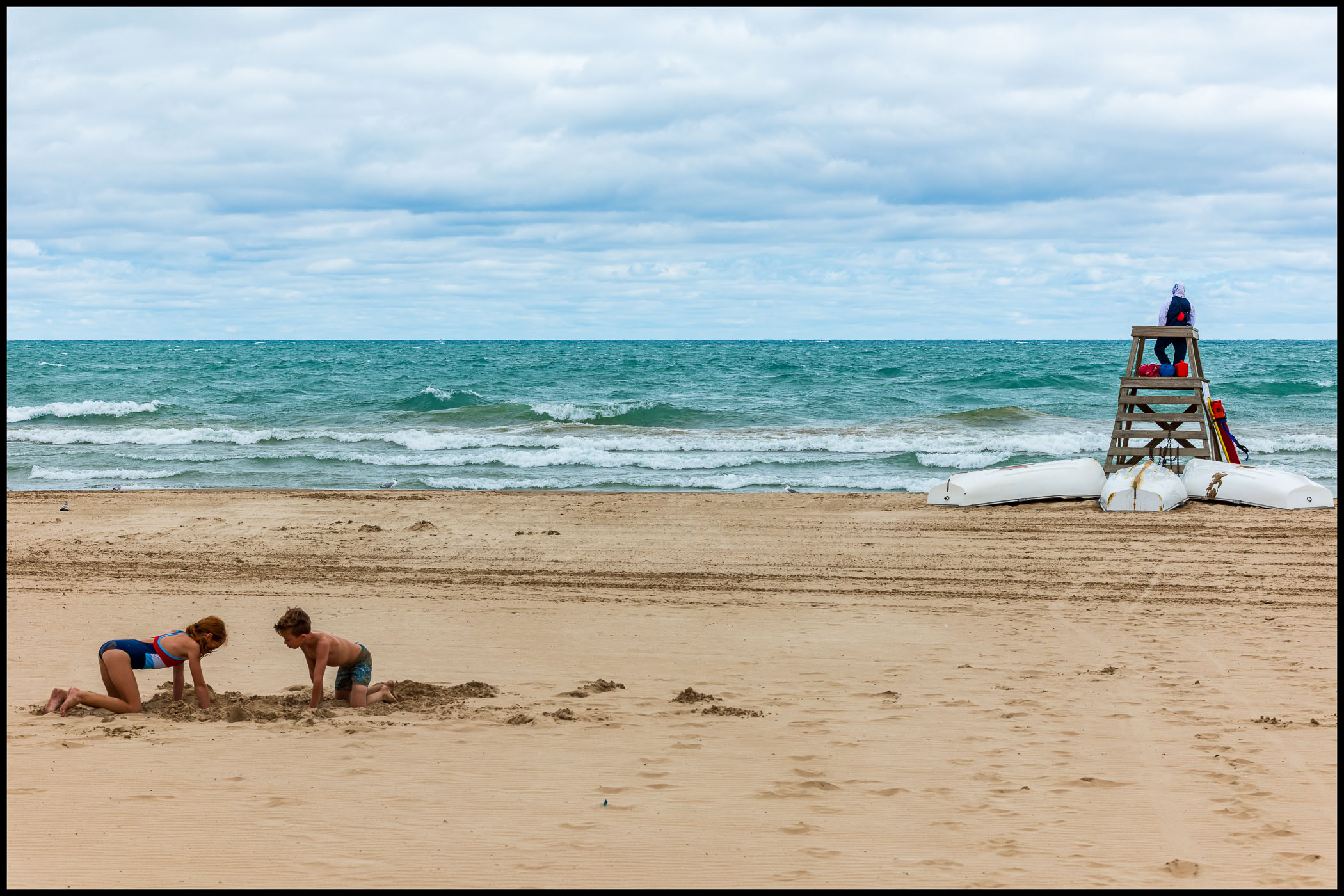 Two kids playing in the sand, oblivious of how chilly it was, as is the lifeguard looking out across the lake for danger. Foster Beach is one of my favourite places to visit, regardless of time of year or weather, as there always seems to be something happening. It might be sailing one day, beach volleyball another, and the trapeze setup, just out of shot here, gets plenty of visitors on less windy days.