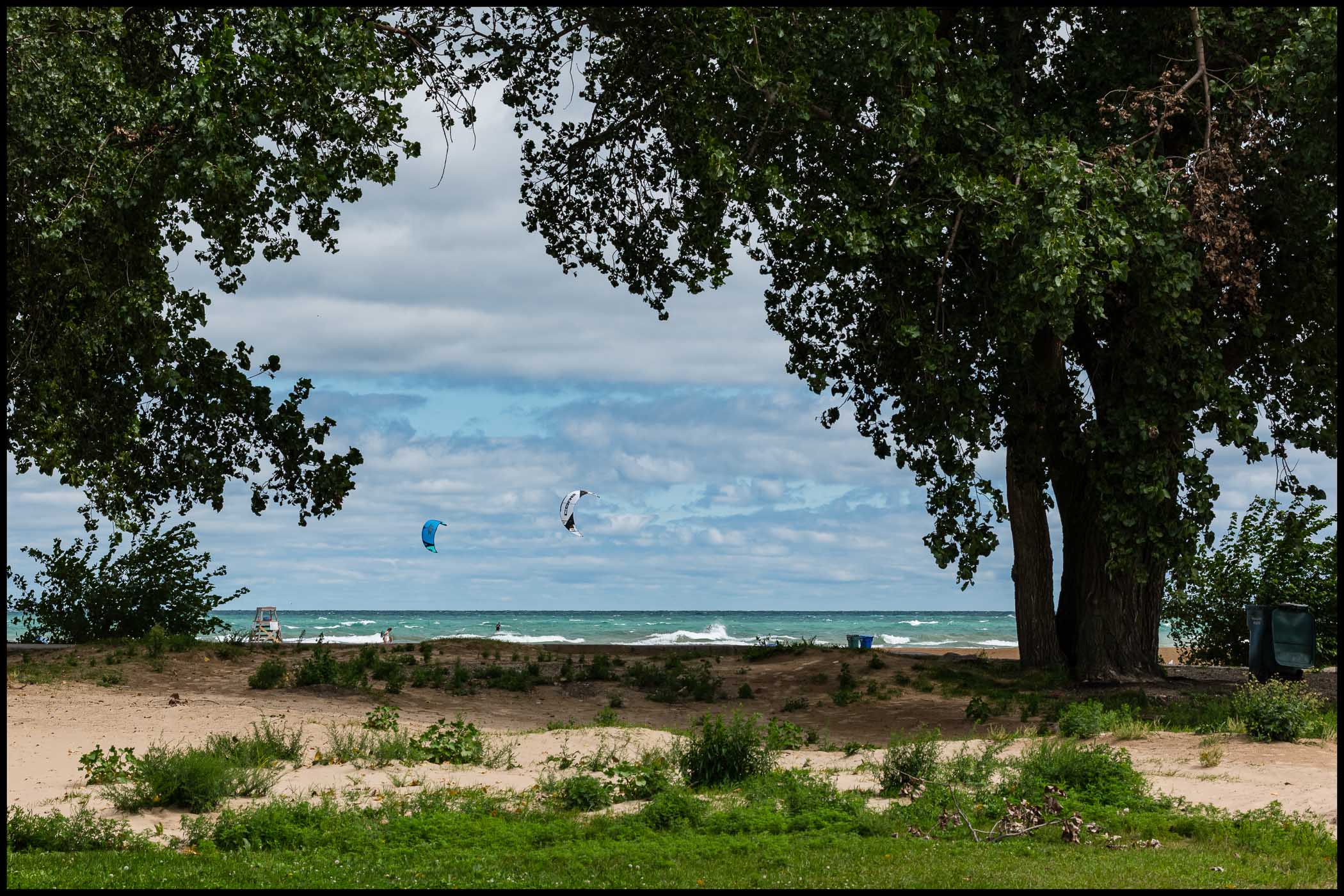 Further south, two windsurfers were taking full advantage of the stiff breeze. It looks like fun until you end up in the water. Like all the Great Lakes, Lake Michiganโs water never really gets warm. A wetsuit would seem essential. And as said earlier, the lens disappointed by hunting to lock onto the windsurfers, despite trying various configurations of focusing and shooting.