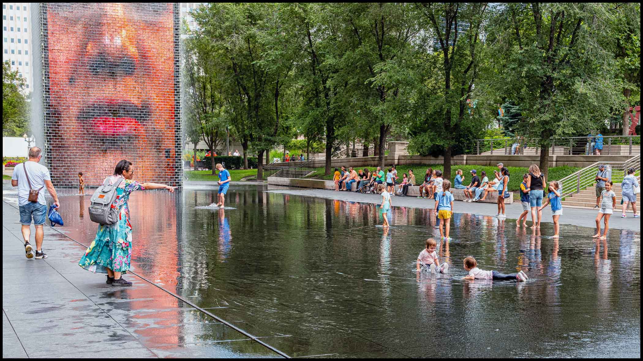 This scene was taken at the Crown Fountain, which displays moving facial images. It squirts water from the mouths of each face. Kids love it and splash around with relish. If they are allowed to. In this instance, you can almost hear the โSTOP THAT!!!โ from the kid’s mother.
