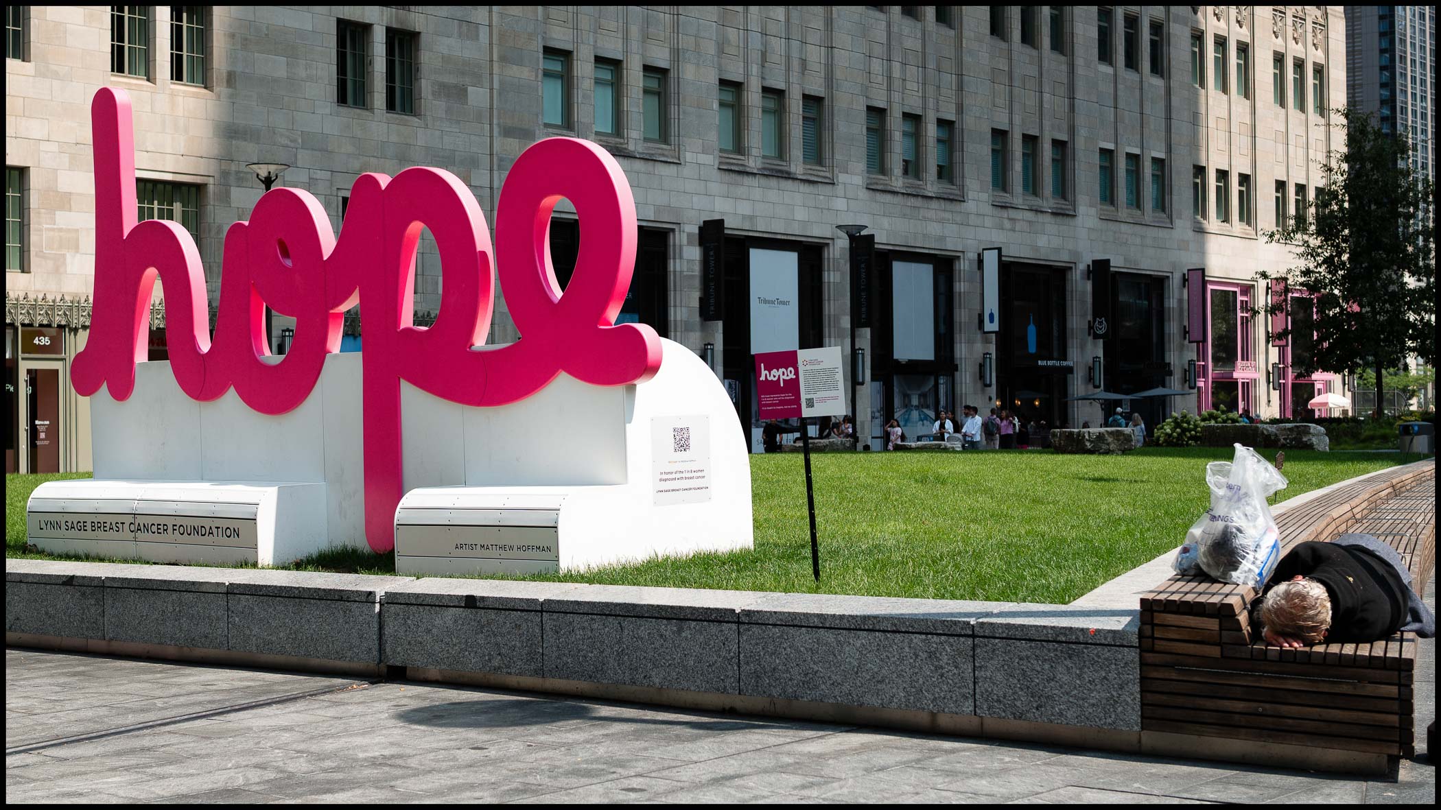An image of contrasts. The โhopeโ sculpture for breast cancer contrasts with the social illness of alcoholism. Hope side-by-side with hopelessness. The man has passed out with his travel bag and empty bottle. You wonder what hope he realistically has in life without help. Did my shot really do them any justice?