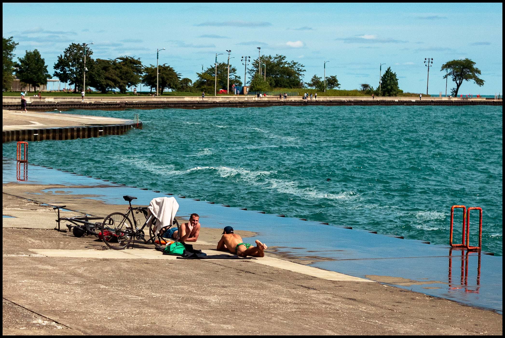The two guys and their bikes, taking a day off by the lake. And I got a wave! In summer on a Friday, this is a great place to be. It was one of those perfect summer days, neither too hot nor too cold, not too breezy and not too humid. So I decided to walk the four miles home along the lake front path. With a camera as light and compact as the D-Lux 109 it’s not a hardship. And a cold beer was my reward.