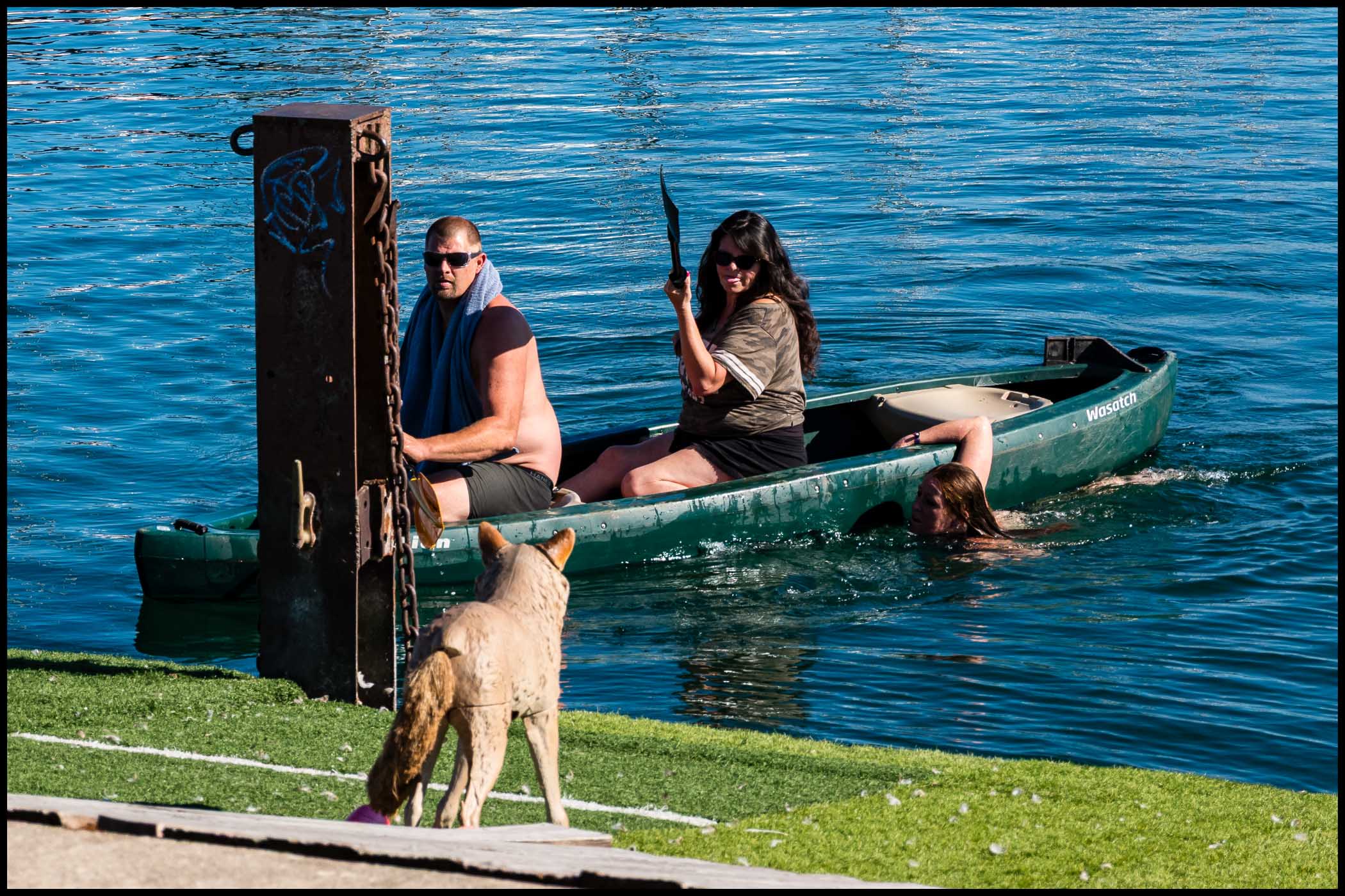 This one of those comic moments you might spot if youโre lucky. The wolf or guard dog is a sculpture that guards this portion of Montrose Harbor. The three people with the canoe look like invaders, which adds a bit of fun to the scene. Mid-contrast keeps the CL + 18-56 in their comfort zone.