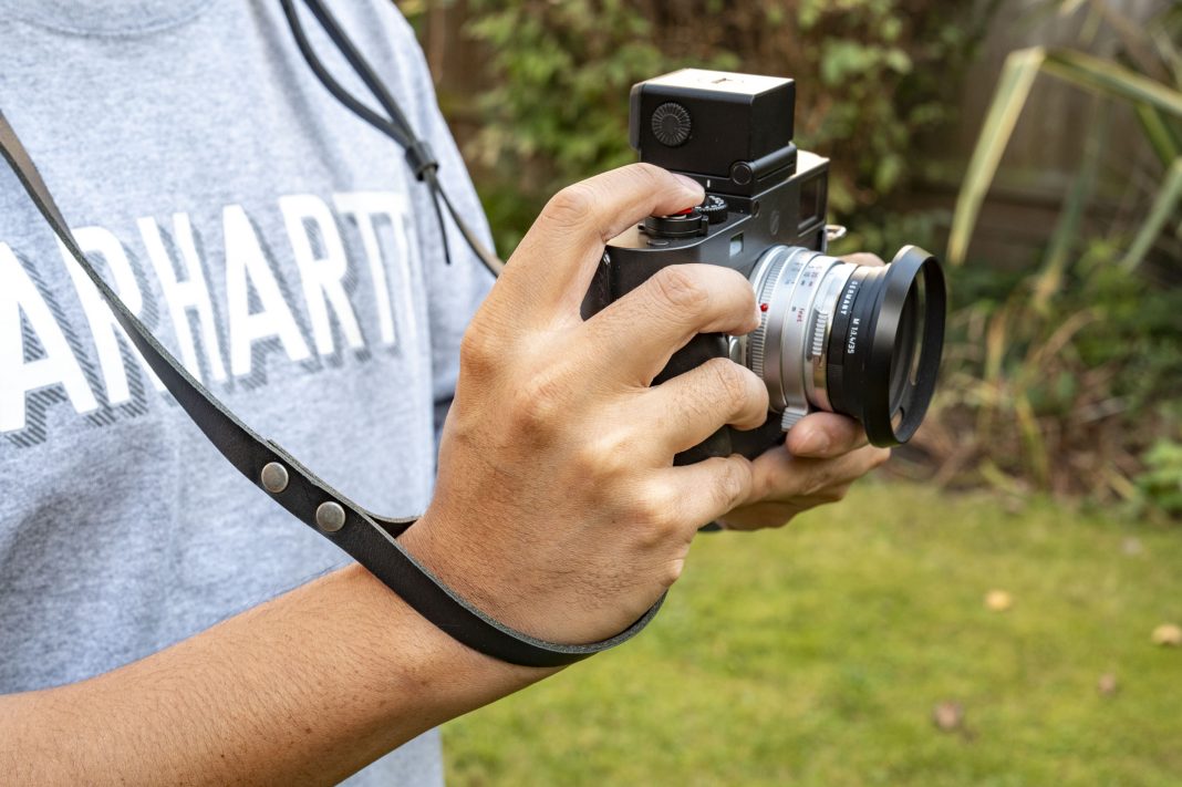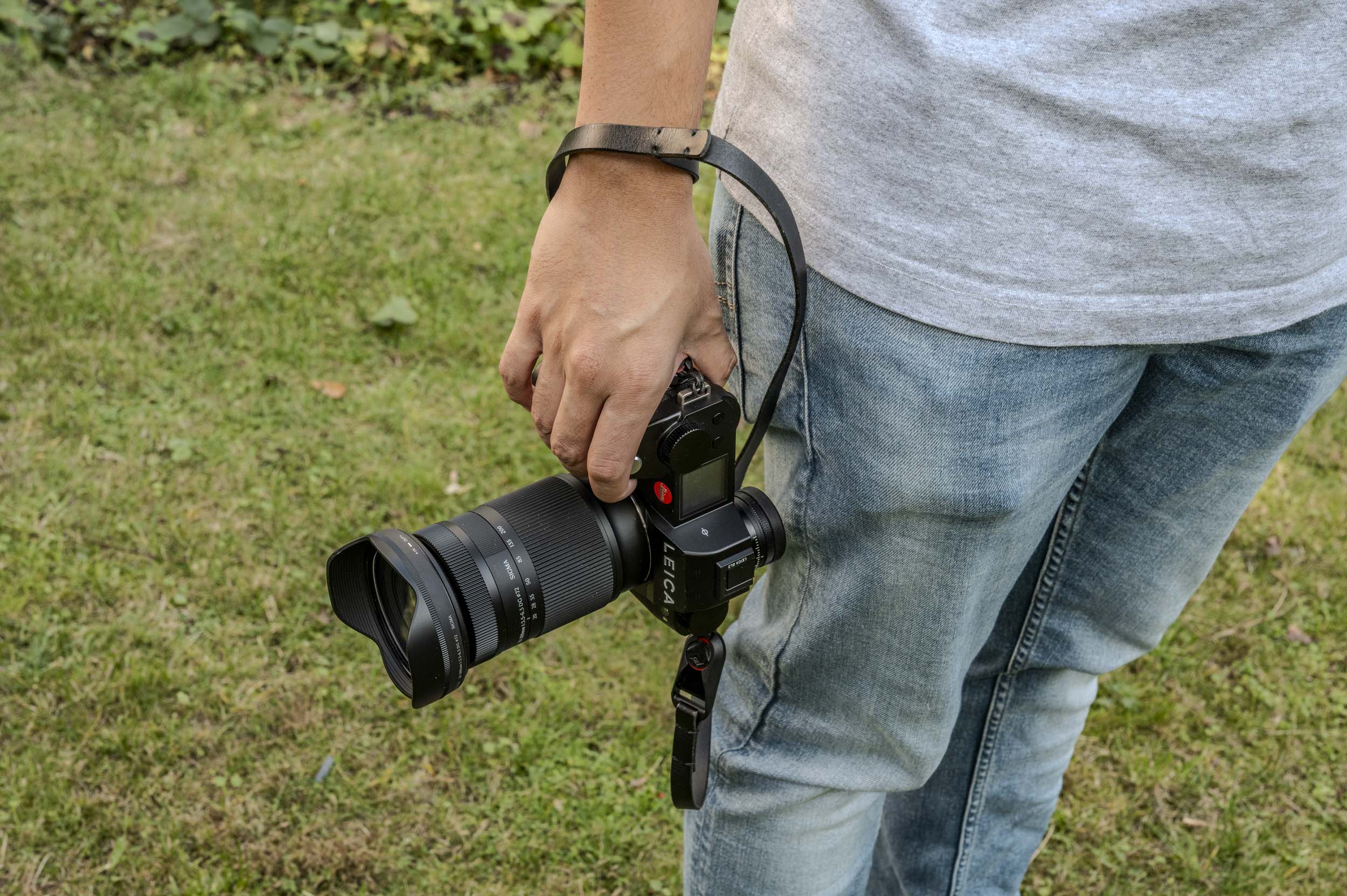 The biggest surprise is how well this narrow strap, with its integral wrist loop, works on the heavier Leica SL3. The slot-style lugs of this camera are not suitable for split-ring attachment, so the fashion is to use straps with leather or fabric ends which slide through the slot.