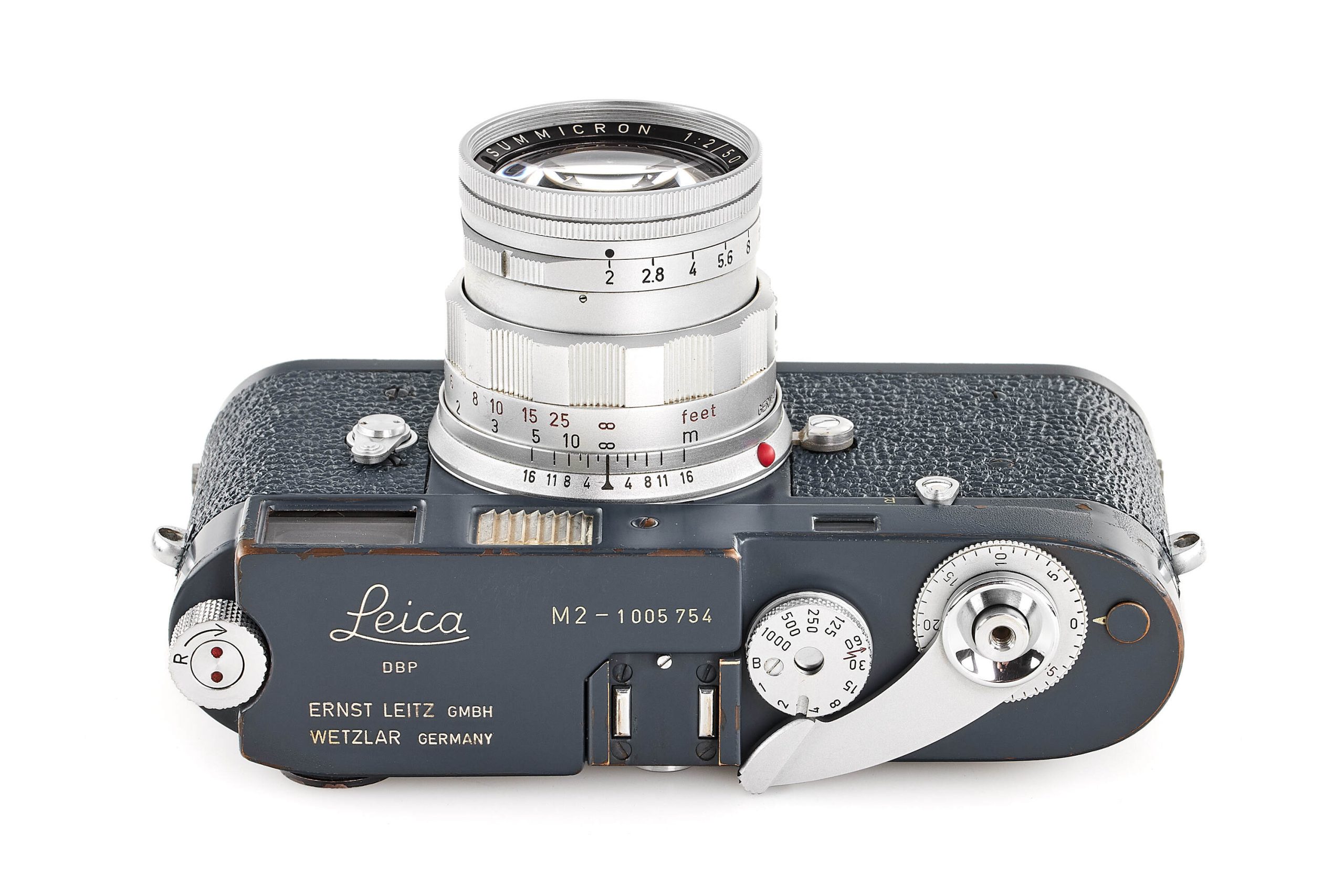 Possibly, the nicest looking camera in the auction is this lovely grey-paint M2. It was produced in 1960 as part of a batch of 20 for the United States Air Force in Europe (USAFE). The cameras were delivered to Wiesbaden on 9 June 1960. This extremely rare camera comes with a fine 50mm f/2 Leitz Rigid Summicron lens.