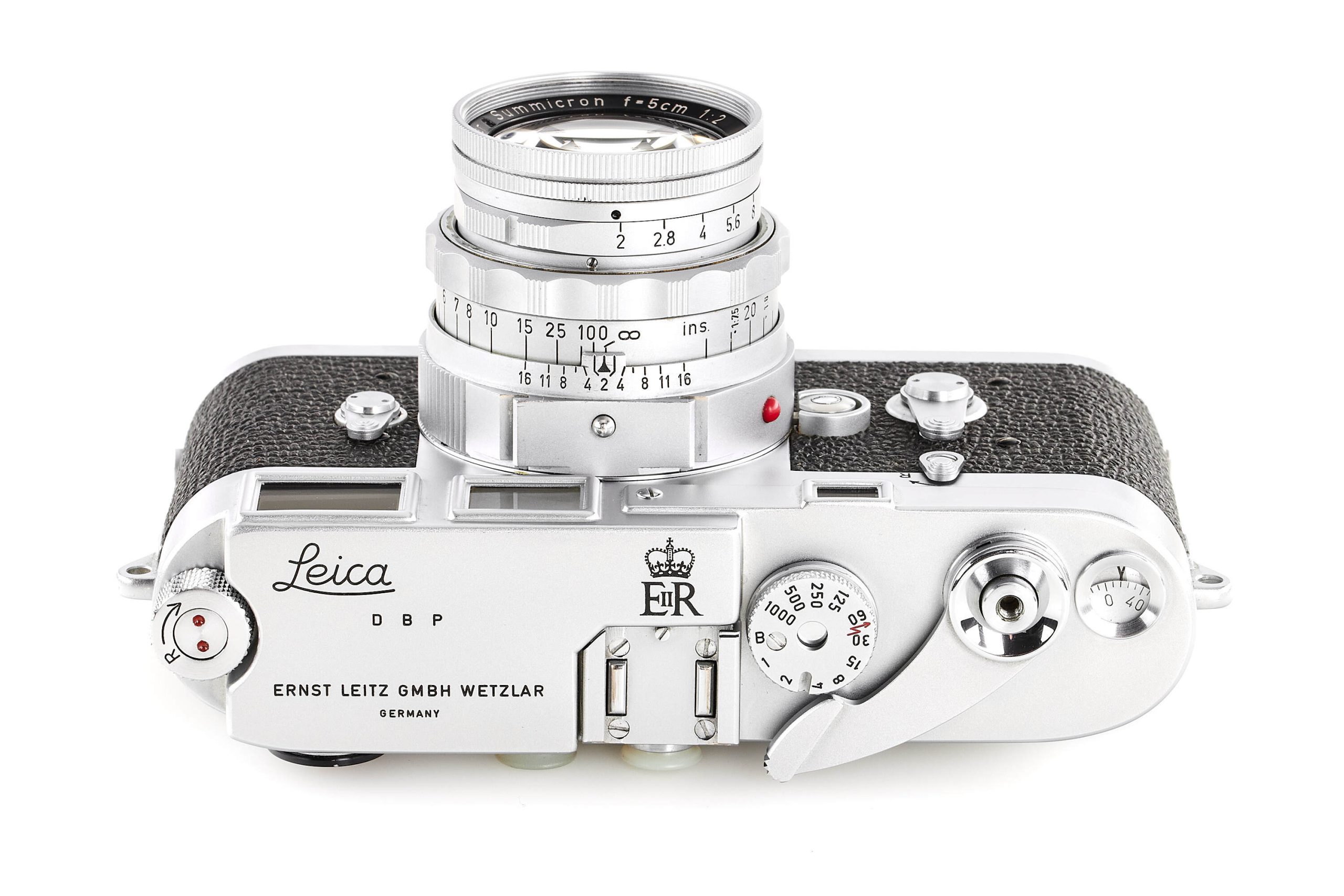 This is not the actual camera presented, but it is rather the backup unit, made alongside the original and retained in the factory in case a replacement was needed. The camera comes with a 50mm Leitz Summicron DR (Dual Range, but without the goggles) with no serial number, which may have been a prototype or pre-production example. The Queen’s name is engraved on the base as ‘Elisabeth’, which is the German spelling.