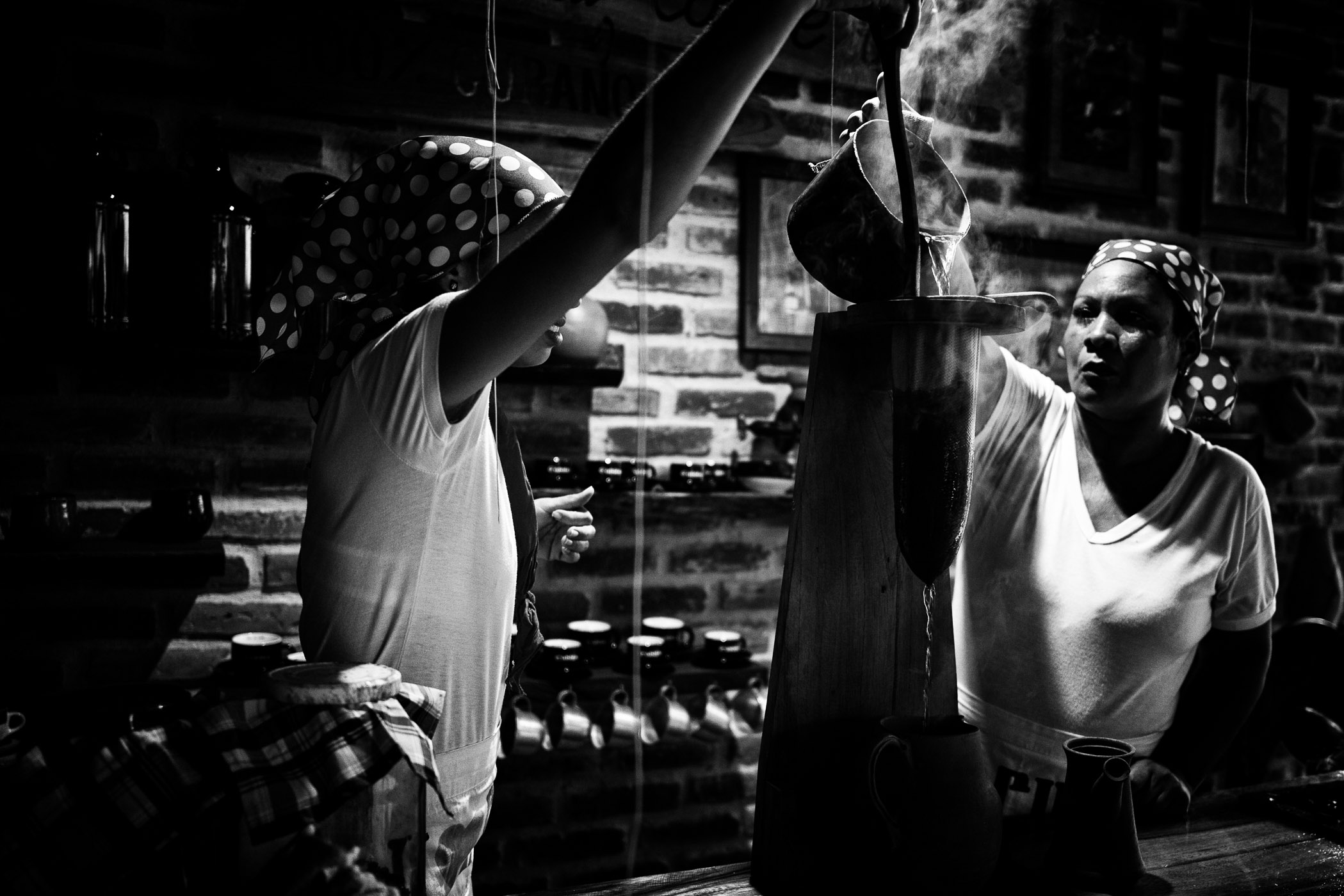 Speaking of coffee, I had my share of great coffee in Cuba. Our group of photographers visited a shop in Santiago de Cuba that specialized in coffee and cigars. In the dim light, I was able to capture two ladies wearing red and white polka dot headscarves carefully pouring hot water over the ground coffee beans.