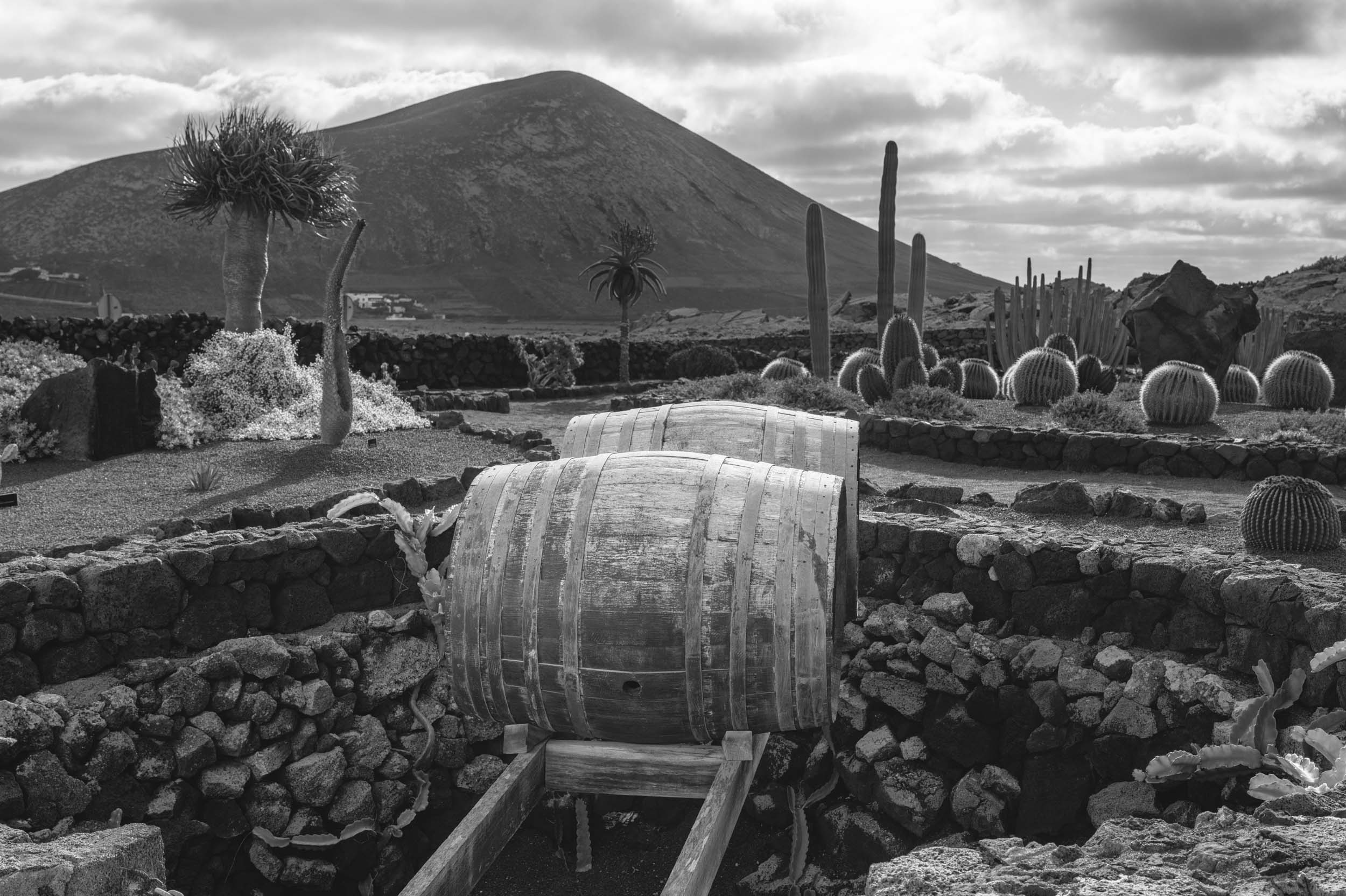 The landscape of Lanzarote is overwhelmingly black because of the universal volcanic ash. Cacti and other plants punctuate the space, creating an unusual desert-type environment. There is little in the way of weed growth, so the overall impression is of a well-tended landscape. At first glance, agriculture appears limited. But a visit to a vineyard such as El Grifo is an eye-opener.