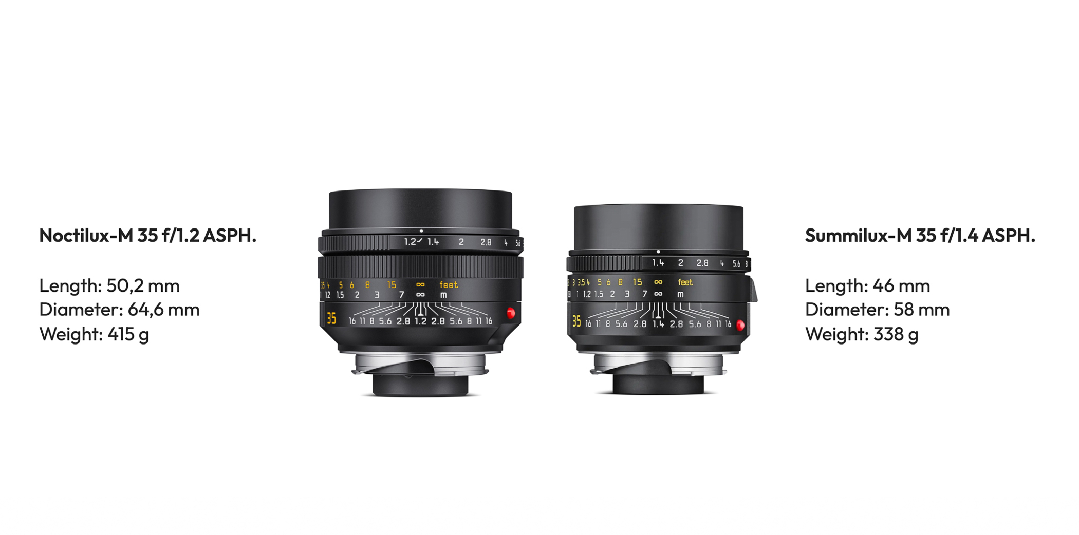 This comparison shows clearly how the Noctilux lenses have improved over the years since 1966, but also how they have become bigger — until the 35mm f/1.2 that is!