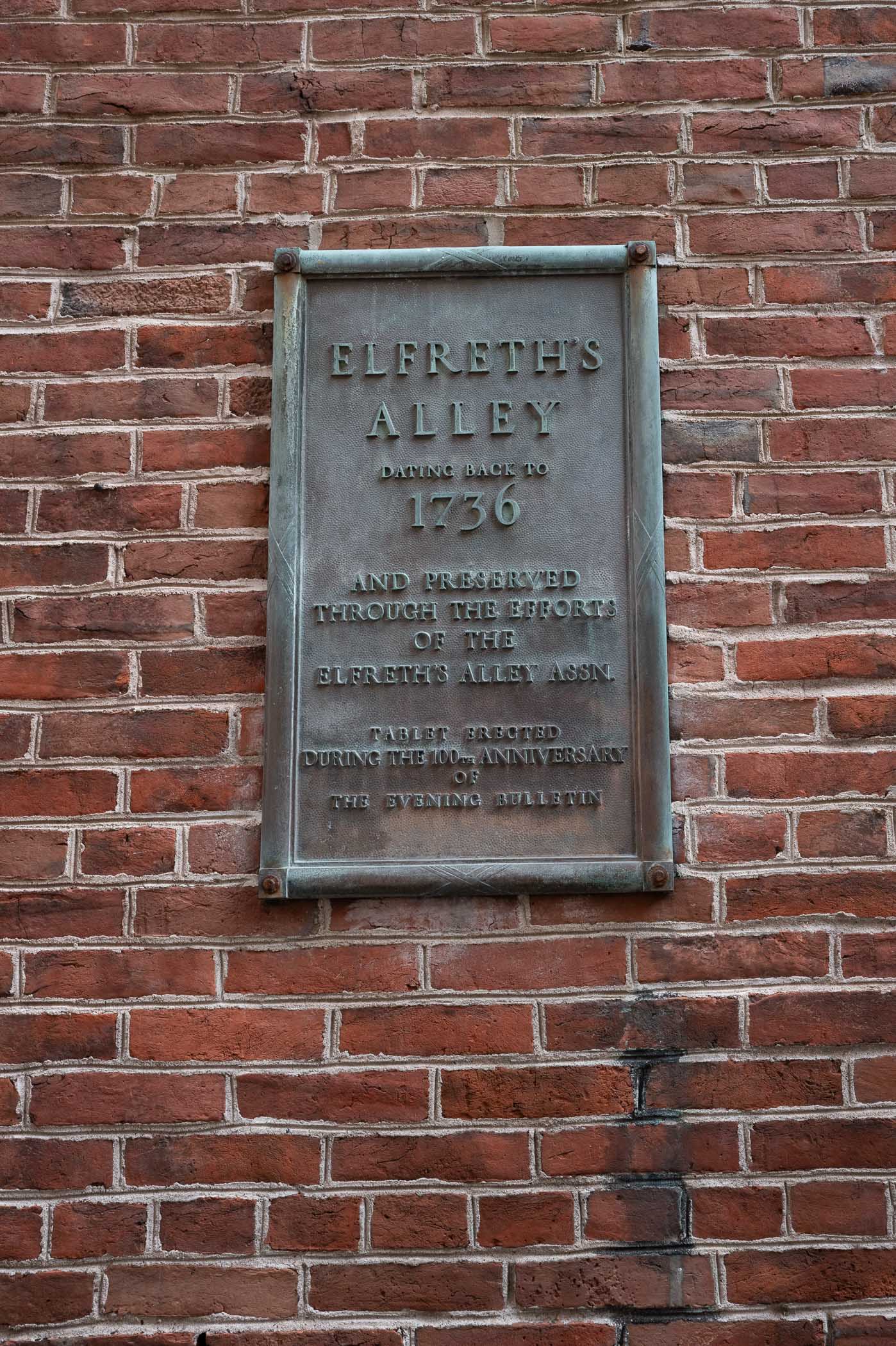In 1703 Arthur Wells and John Gilbert created a narrow cart path between their properties, which extended from Front St. to Second St. The area was already overcrowded with rental properties that enabled traders to have as easy access as possible to the port. The path became known as Elfreth’s Alley, after Jeremiah Elfreth, who was a local blacksmith. It is the oldest continuously occupied street of row (terraced) houses in the USA, dating back to 1736, and was outside the original plans for Philadelphia.