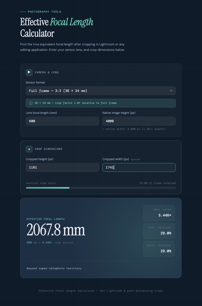 But, have you ever wondered what the effective focal length of your cropped image is? Putting it another way, what focal length would you have needed to directly capture that enlarged final image?